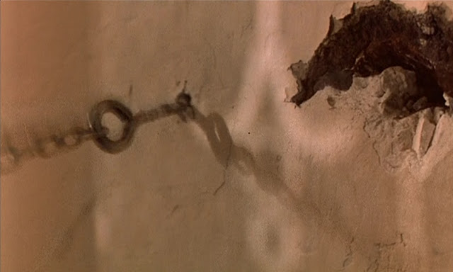 The camera follows closely behind as this young girl makes here way down the isolated road towards the house. The ominous music spells nothing other than complete lonesomeness and horrifying impending death, but the viewer can do nothing more than look on with excited interest. As she approaches the house, we see that someone is spying on her every action and behavior. And that's when the chains screwed into the walls begin to get tugged furiously. What in the fuck!?